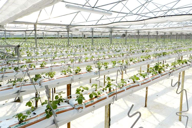 The multi-span greenhouses with vertical walls are perfect for growing strawberries, blackberries, raspberries and blueberries in soilless cultivation using coco-perlite substrate.
